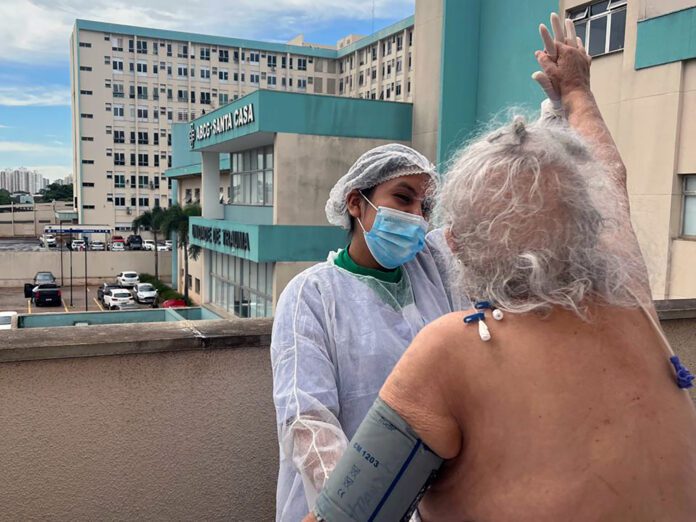 Com humor e esperança, os fisioterapeutas da Santa Casa de Campo Grande humanizam o tratamento e cuidam dos pacientes internados na instituição. Um dos processos que contribui para a recuperação dos hospitalizados, é levar o paciente até o ambiente externo com segurança para que ele consiga tomar um banho de sol.