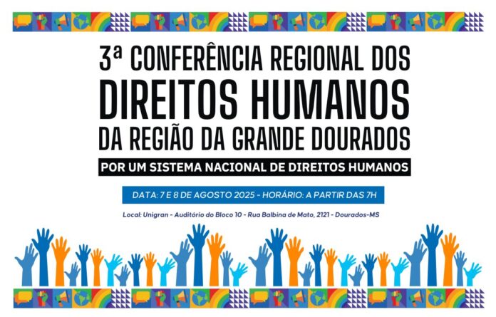Nos dias 7 e 8 de agosto, Dourados será palco da 3ª Conferência Regional de Direitos Humanos e Cidadania, que acontece no auditório do Bloco 10 da Unigran, parceira institucional do evento. Com o tema central “Por um Sistema Nacional de Direitos Humanos: Consolidar a Democracia, Resistir aos Retrocessos e Avançar na Garantia de Direitos para Todas as Pessoas”, a conferência reunirá representantes de 13 municípios da região da Grande Dourados.