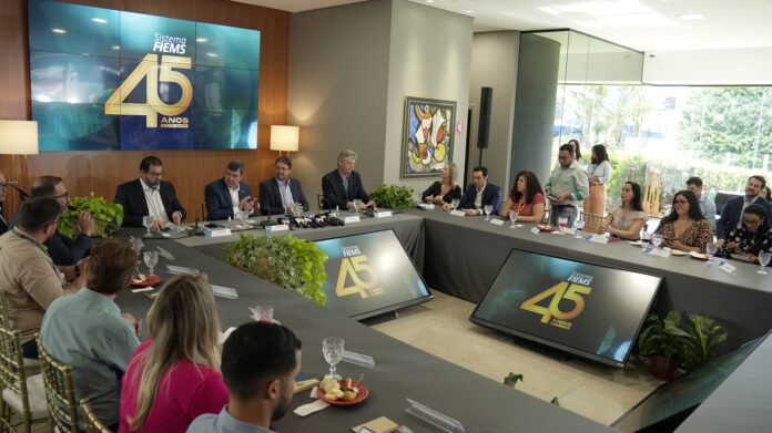 Como parte da programação dos 45 anos do Sistema Fiems, o presidente Sérgio Longen recebeu no Edifício Casa da Indústria, em Campo Grande, jornalistas dos principais veículos de comunicação em Mato Grosso do Sul para um café da manhã nesta segunda-feira (06/05), acompanhado do governador do Estado, Eduardo Riedel. O evento serviu para apresentar os principais indicadores econômicos da indústria, as ações a serem realizadas pelo Sistema Fiems em parceria com o governo do Estado e os investimentos privados que estão programados para os próximos anos.