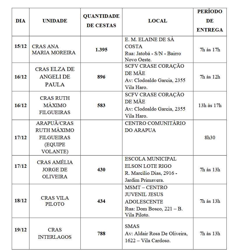 A Prefeitura de Três Lagoas, por meio da Secretaria Municipal de Assistência Social (SMAS), inicia no próximo dia 15 de dezembro a campanha “Natal Solidário”, que neste ano vai garantir a entrega de 4.526 cestas básicas para famílias acompanhadas pelos CRAS do município. As distribuições ocorrerão entre os dias 15 e 19 de dezembro, sempre a partir das 7h.