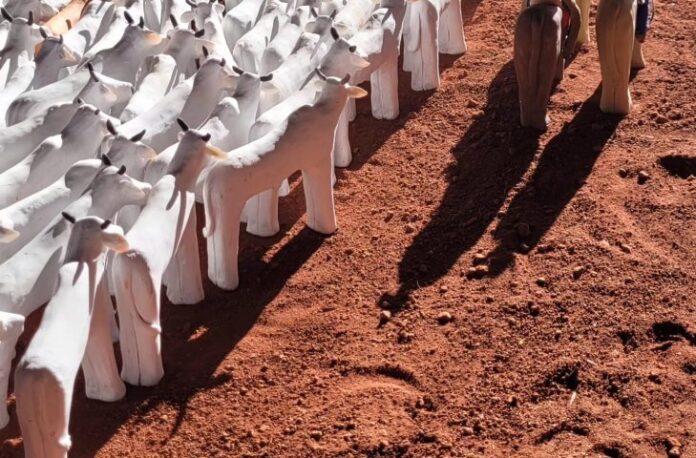 “Vou apresentar uma instalação feita de argila que representa uma comitiva de gado e é um trabalho que conta um modo de vida, uma prática que está enraizada no cotidiano dos pantaneiros. Desperta memórias afetivas, tem identidade, tradição, cultura. Emociona as pessoas, né? E mostrar essa obra na Bienal tem muita importância para mim, porque é poder celebrar nossas raízes, valorizar nossos costumes, as nossas tradições”, explica a artista plástica sul-mato-grossense Buga Peralta.